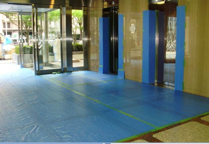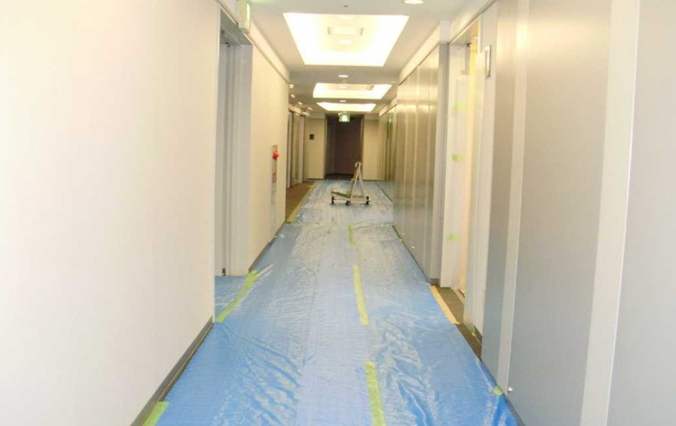 2、着工当日、搬出経路の養生作業 工事機材や資材、撤去材の搬入搬出時にエレベーターや廊下などの壁や床に傷がつかないように養生を行う。