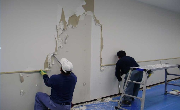 6、クロス工事 壁面クロスのめくりと貼り替え。めくった際のパテによる下地調整が大切。最近のテナントビルの場合は、壁面はクロス貼り仕上げが一般的。
