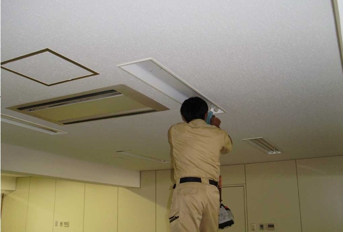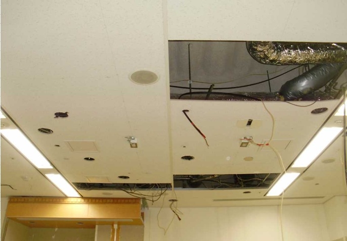 4、天井・壁面等の補修工事 増設工事に伴って発生した天井ボードや壁面の破損箇所の補修を行う。