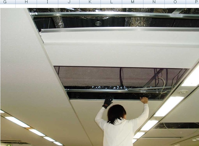 9、清掃工事 照明器具の反射板、窓サッシュ、エアコン、換気扇等の洗い清掃。ブラインドの清掃は、いったん取り外してメーカーの工場で洗い、操作紐の取り替えやスラットの不良箇所を取り替えればベスト。最後に掃除機で床を清掃して完了。