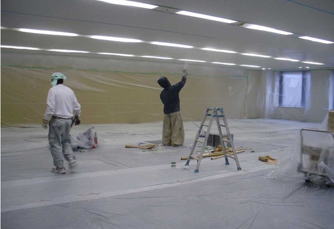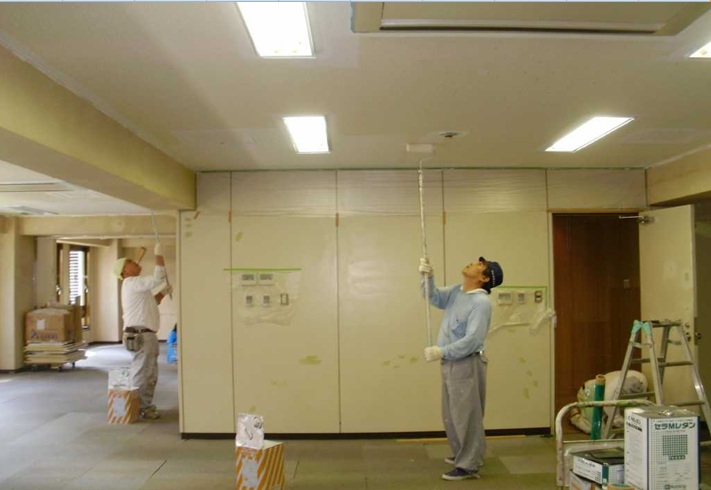 5、塗装工事 天井面、鉄扉、窓枠や面台の塗装を行う。天井面は吹付け塗装かローラーによる施工が一般的。塗装工事で一番の問題は臭気なので休日がおすすめ。