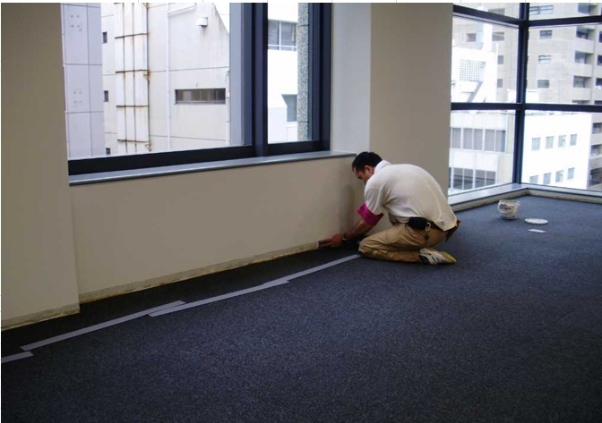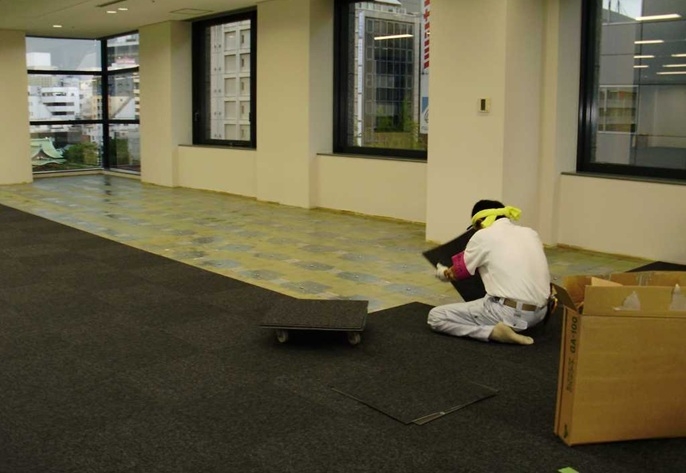 7、タイルカーペット工事 既存のタイルカーペットのめくりと貼り替え。ピールアップボードで市松貼り施工が一般的。ソフト巾木もいっしょに施工。